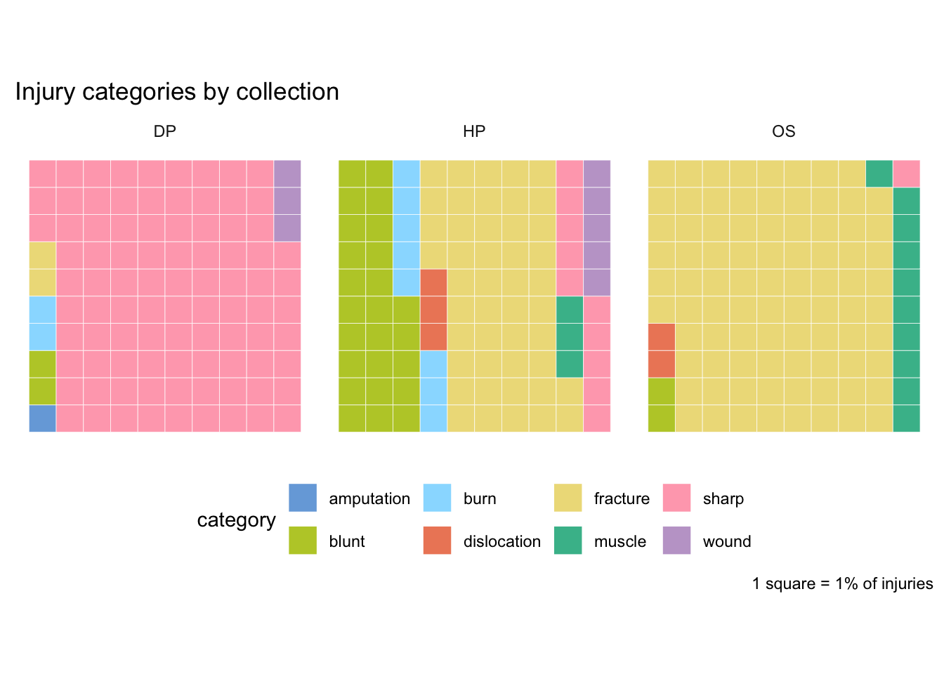 As already seen with injury location regions, the distribution of injury categories varies a lot between the collections. DP is dominated by sharp force injuries; many of these are scars, which reflects the nature of the DP records as recording long personal histories of physical misfortune and violence. OS is equally dominated by fractures, the injuries most likely to remain visible on skeletal evidence. HP, on the other hand, shows a more varied record of mishaps and accidents, though fractures are still the largest single category.